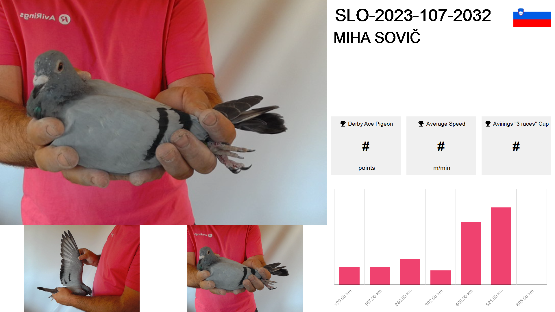 | Race | Position | Number of pigeons | Percent | Speed | Distance |