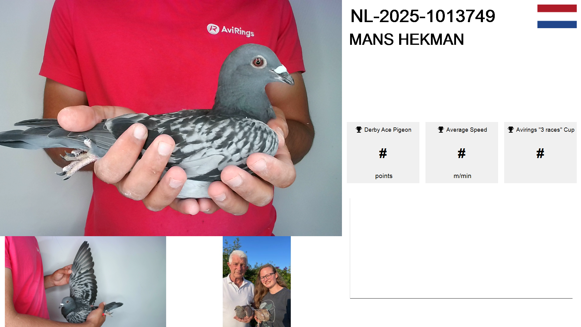 | Race | Position | Number of pigeons | Percent | Speed | Distance |