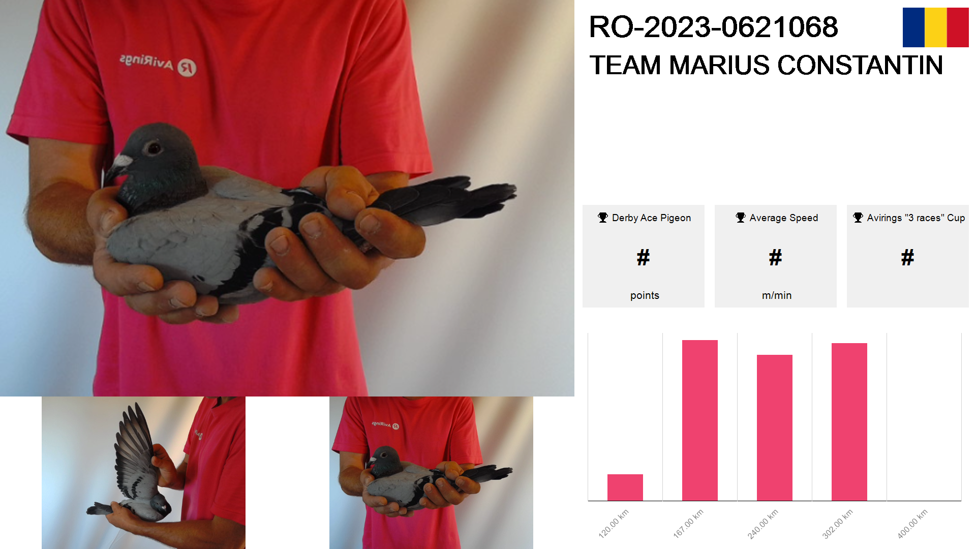 | Race | Position | Number of pigeons | Percent | Speed | Distance |