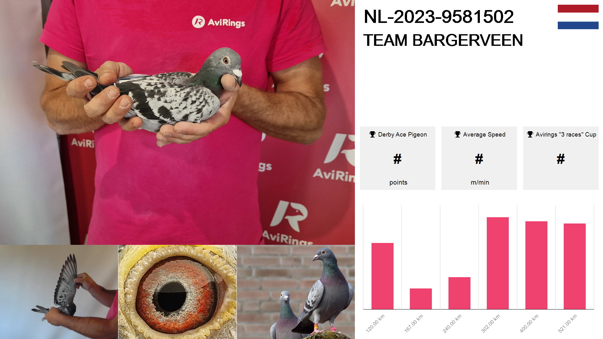 | Race | Position | Number of pigeons | Percent | Speed | Distance |