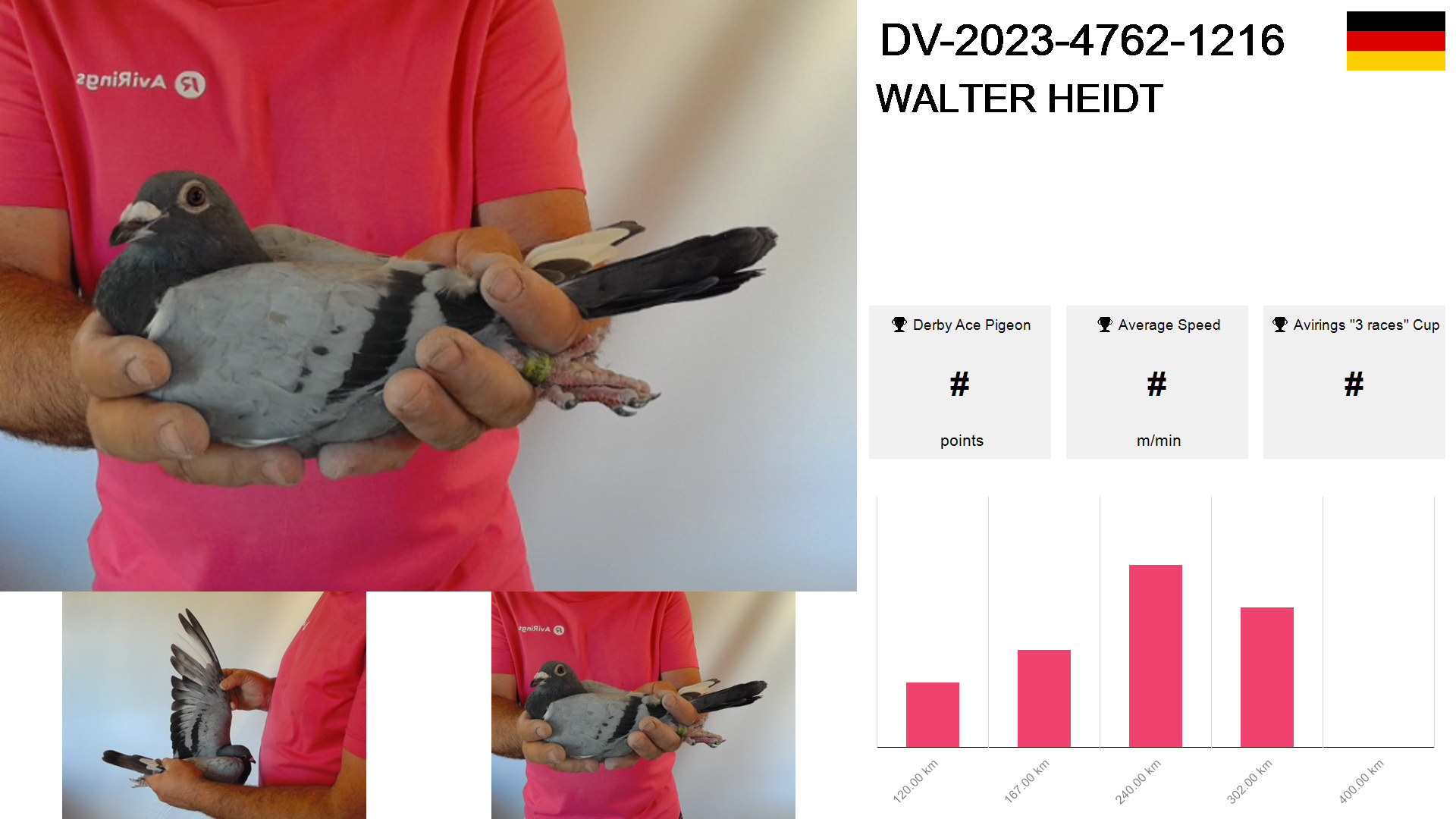 | Race | Position | Number of pigeons | Percent | Speed | Distance |