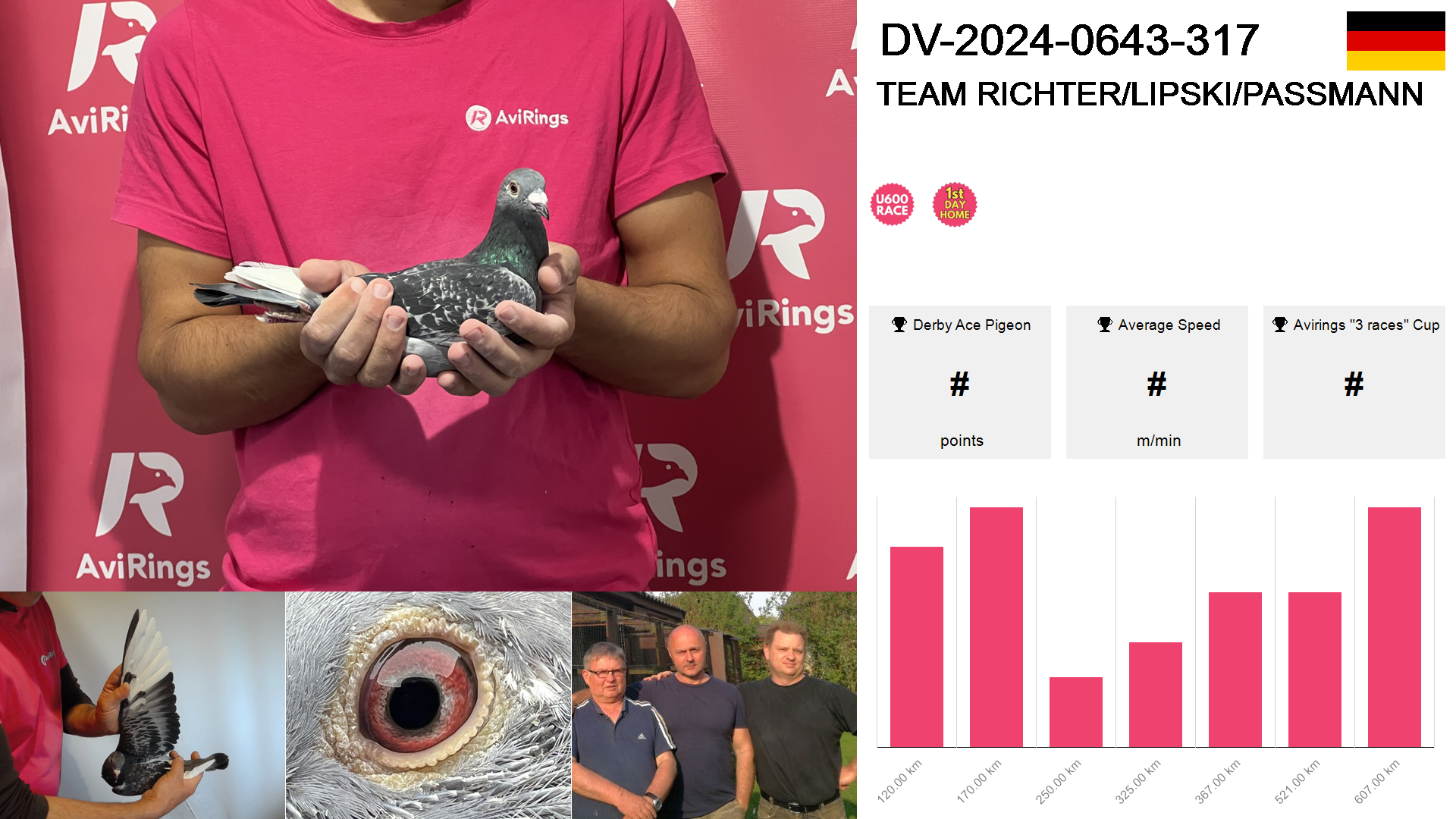 | Race | Position | Number of pigeons | Percent | Speed | Distance |