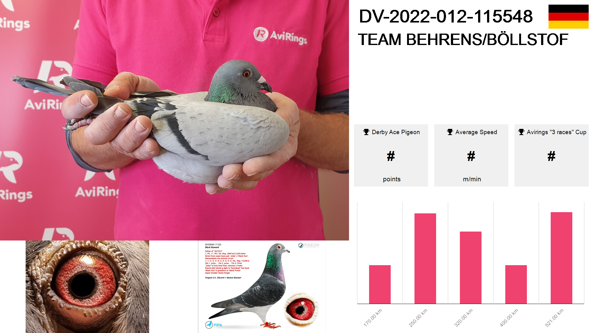 | Race | Position | Number of pigeons | Percent | Speed | Distance |