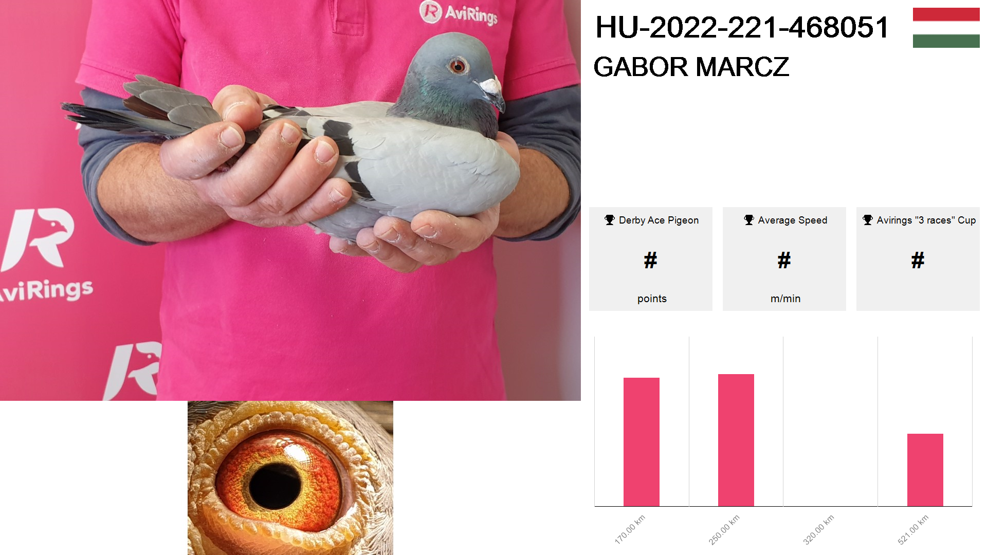 | Race | Position | Number of pigeons | Percent | Speed | Distance |