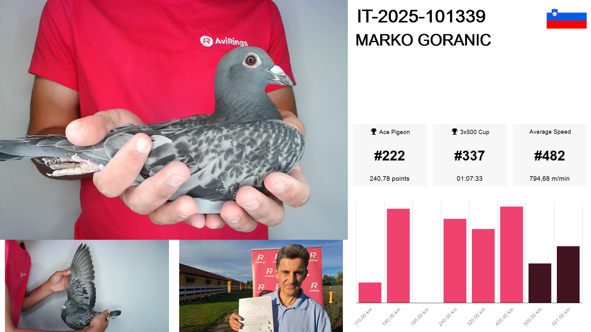 | Race | Position | Number of pigeons | Percent | Speed | Distance |
