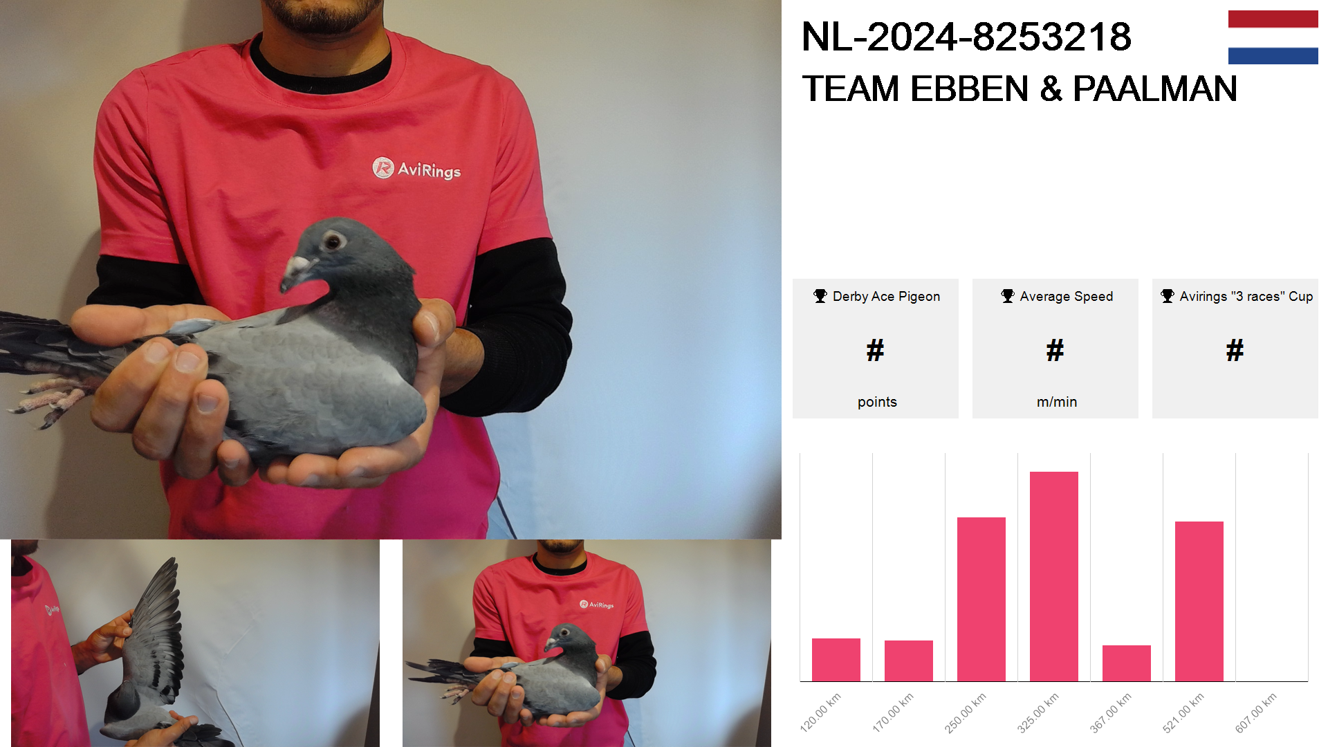 | Race | Position | Number of pigeons | Percent | Speed | Distance |