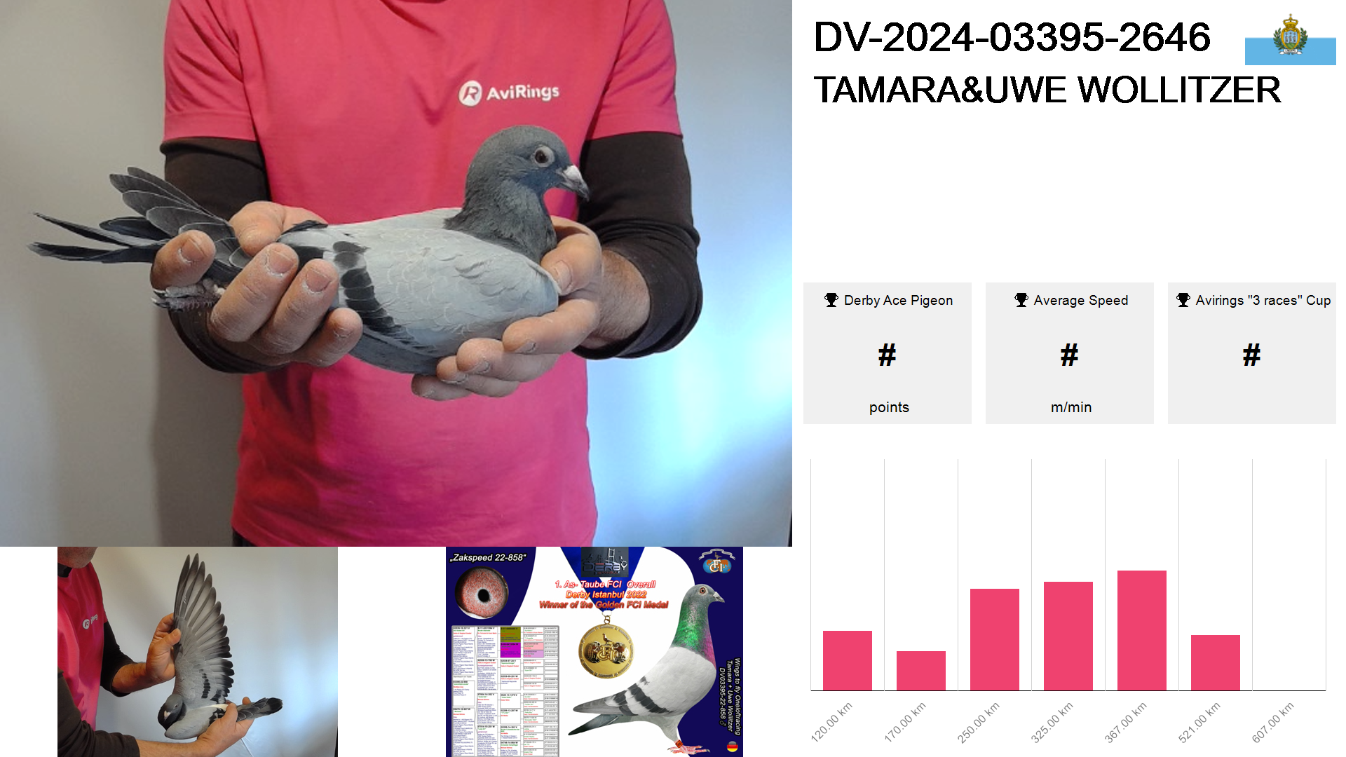 | Race | Position | Number of pigeons | Percent | Speed | Distance |