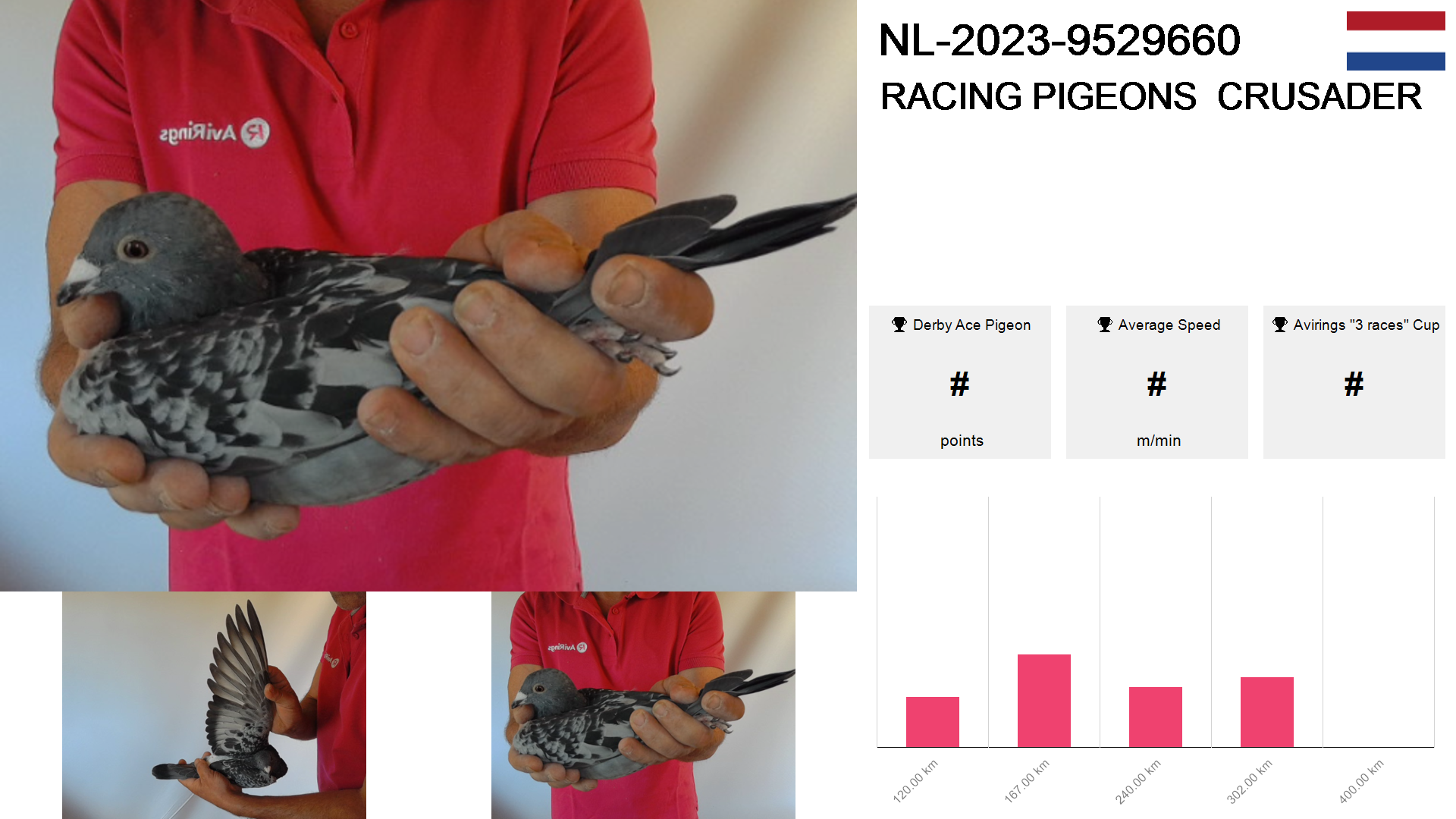| Race | Position | Number of pigeons | Percent | Speed | Distance |