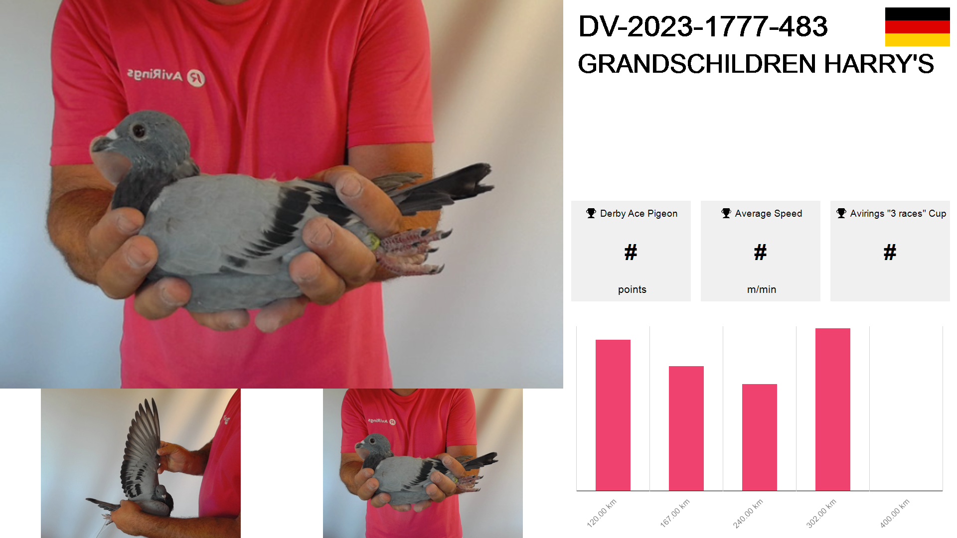 | Race | Position | Number of pigeons | Percent | Speed | Distance |