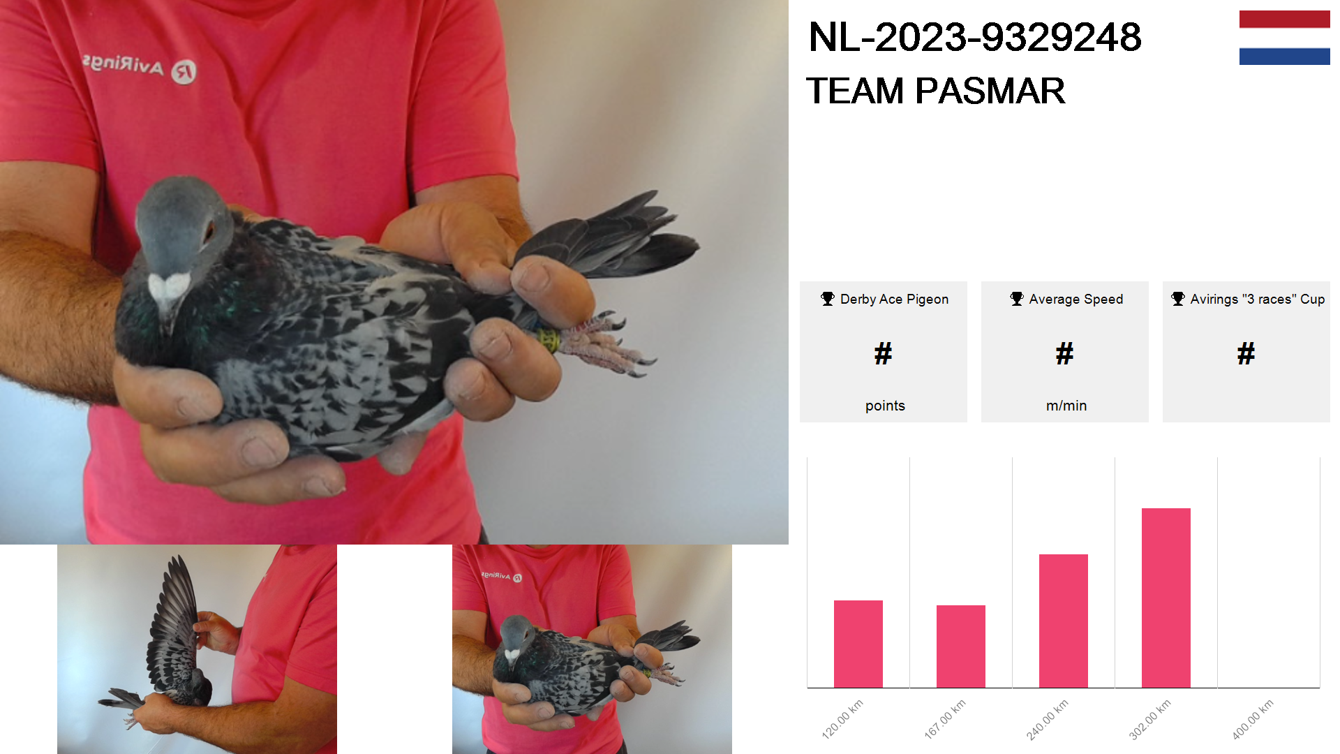 | Race | Position | Number of pigeons | Percent | Speed | Distance |
