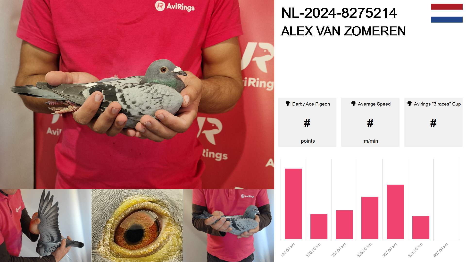 | Race | Position | Number of pigeons | Percent | Speed | Distance |