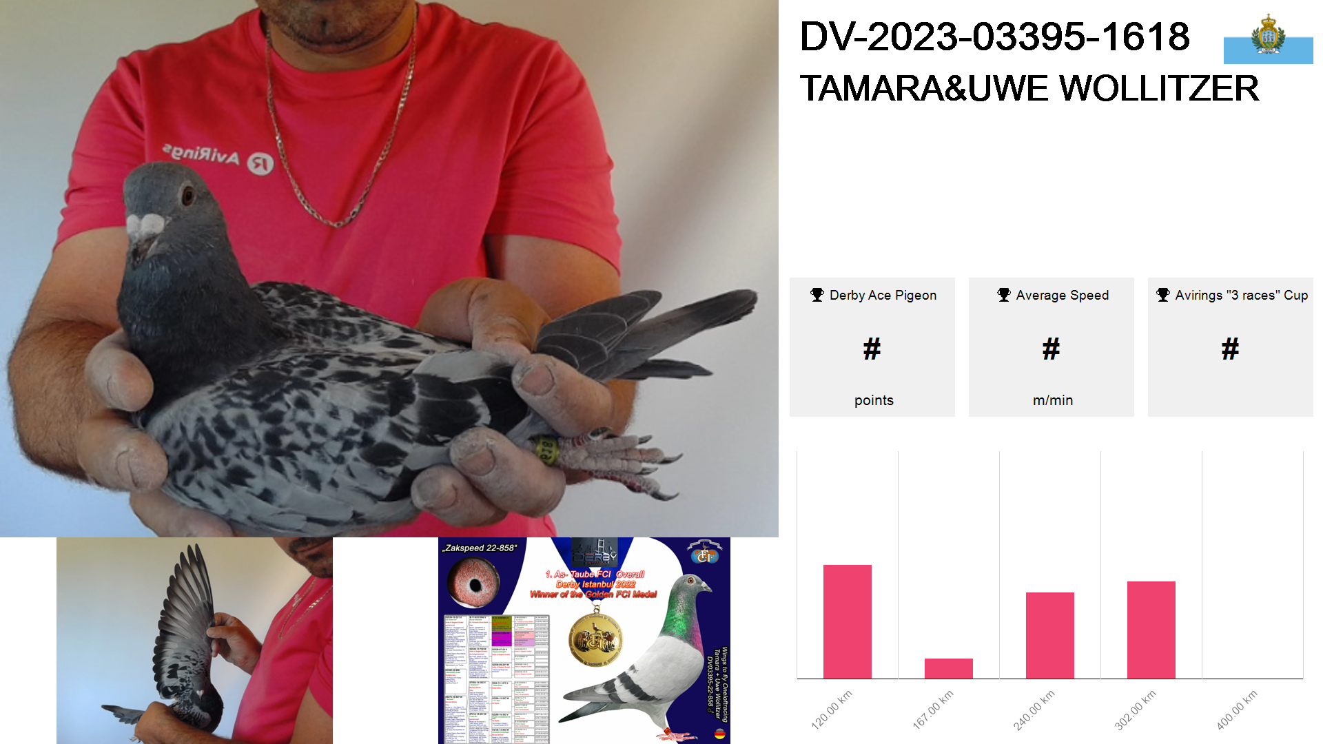 | Race | Position | Number of pigeons | Percent | Speed | Distance |