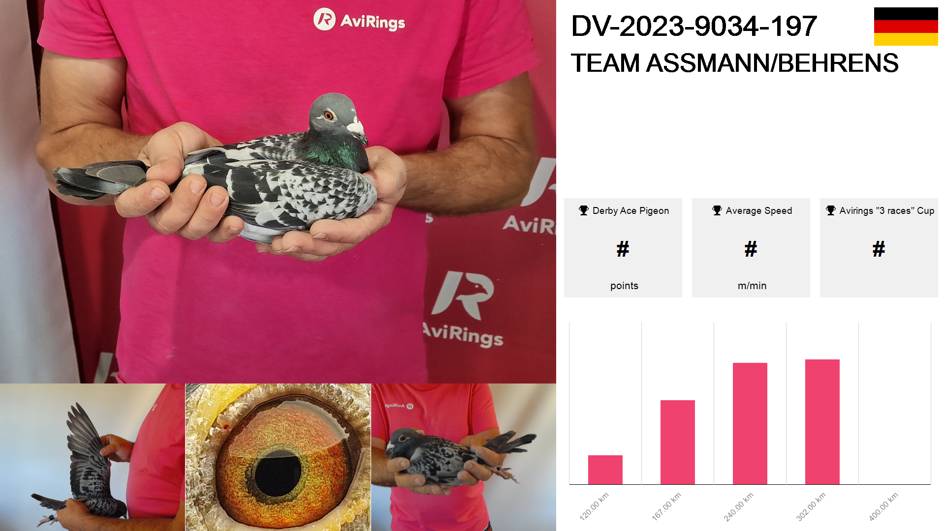 | Race | Position | Number of pigeons | Percent | Speed | Distance |