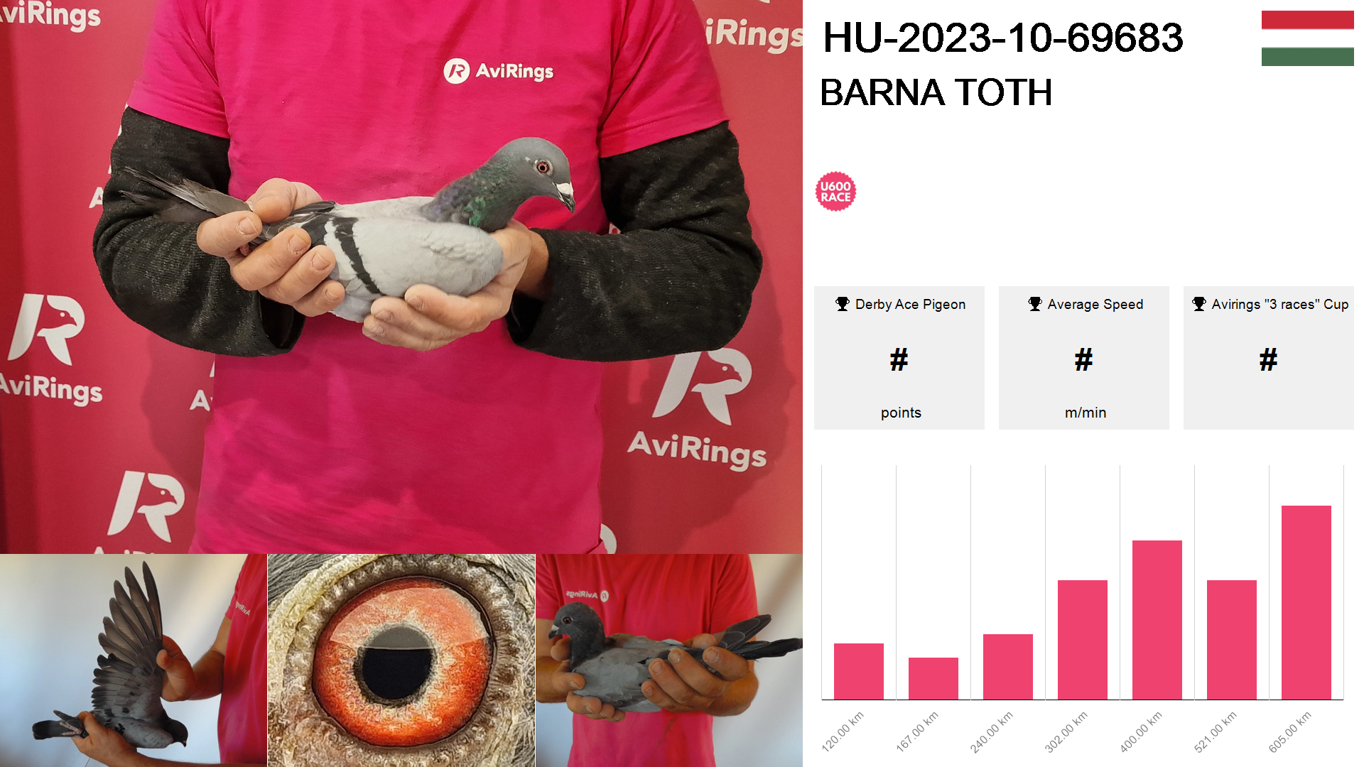 | Race | Position | Number of pigeons | Percent | Speed | Distance |