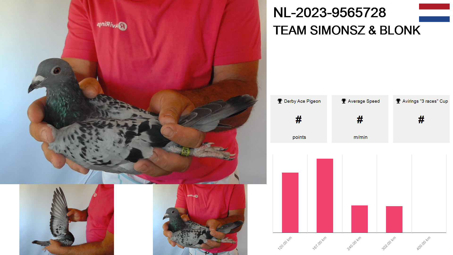 | Race | Position | Number of pigeons | Percent | Speed | Distance |