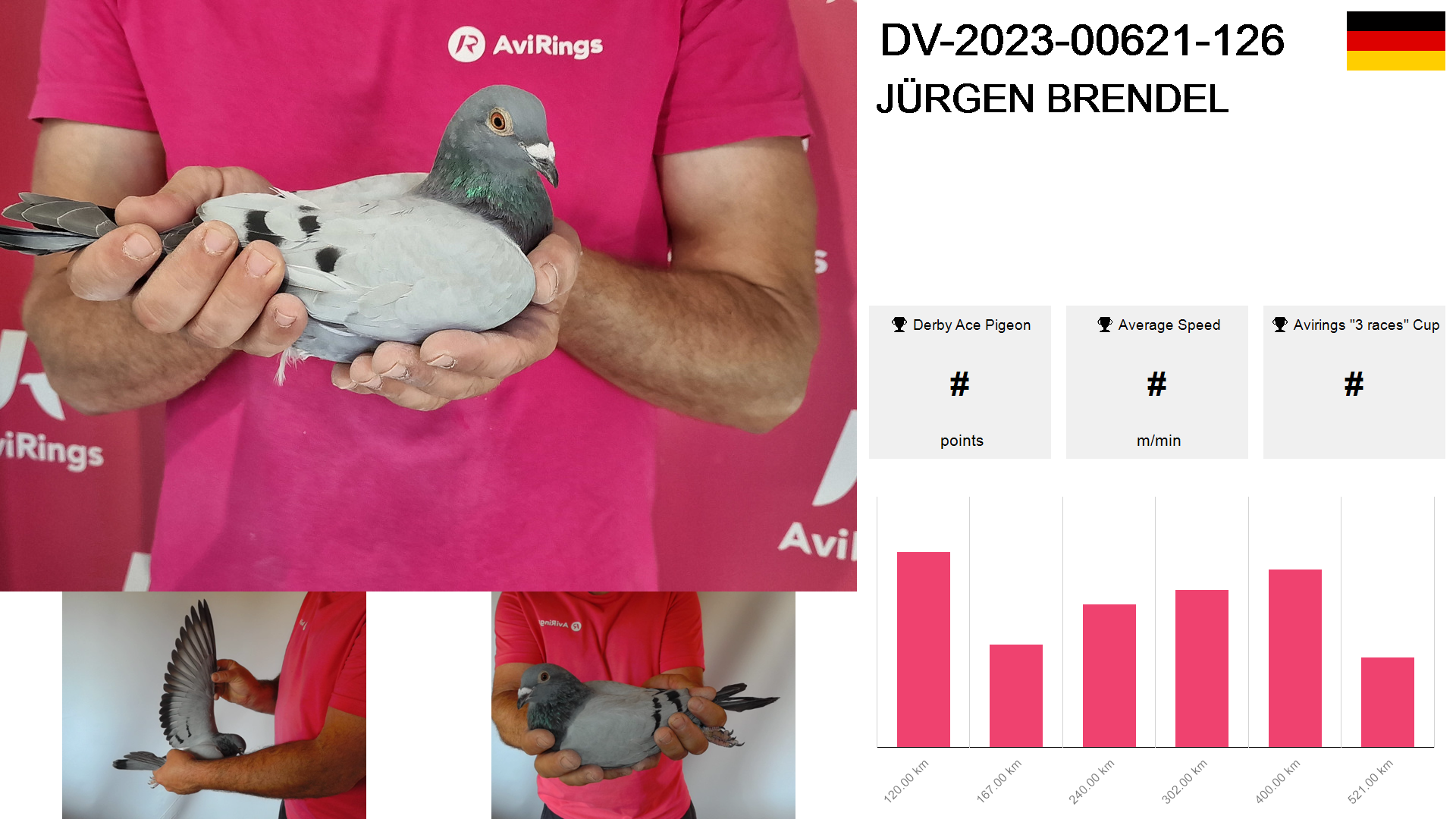 | Race | Position | Number of pigeons | Percent | Speed | Distance |