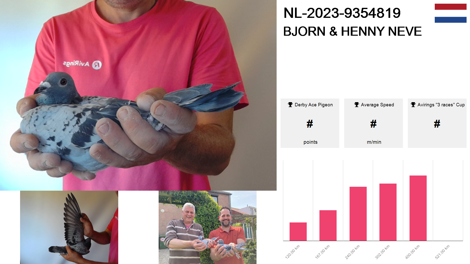 | Race | Position | Number of pigeons | Percent | Speed | Distance |