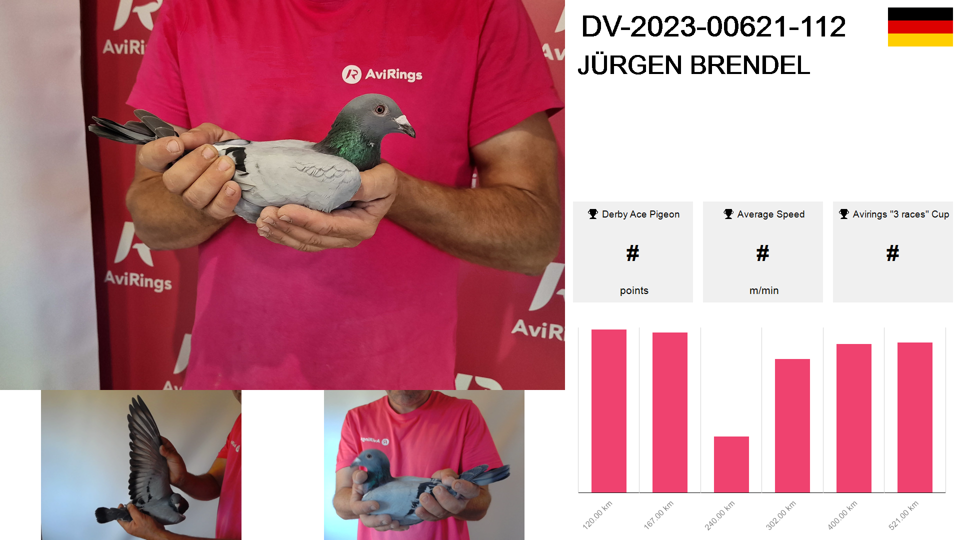 | Race | Position | Number of pigeons | Percent | Speed | Distance |