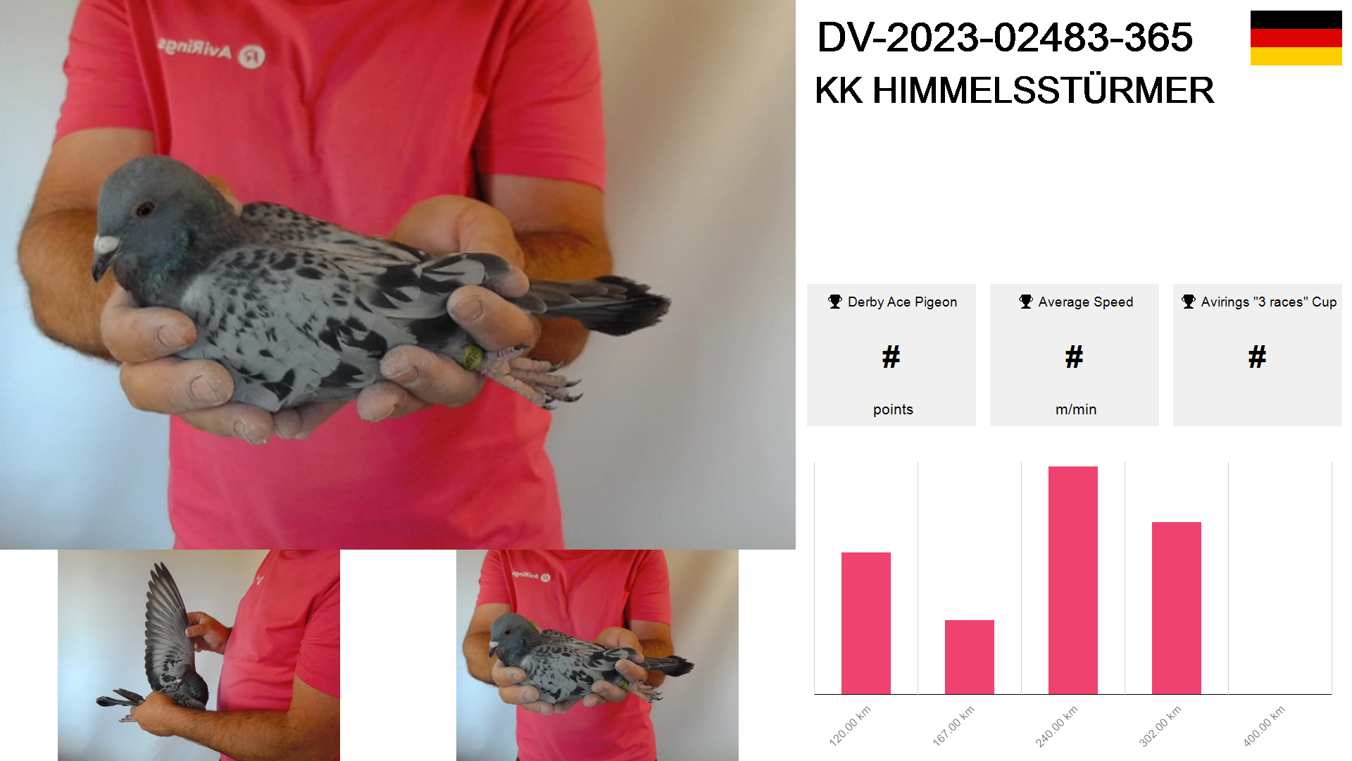| Race | Position | Number of pigeons | Percent | Speed | Distance |