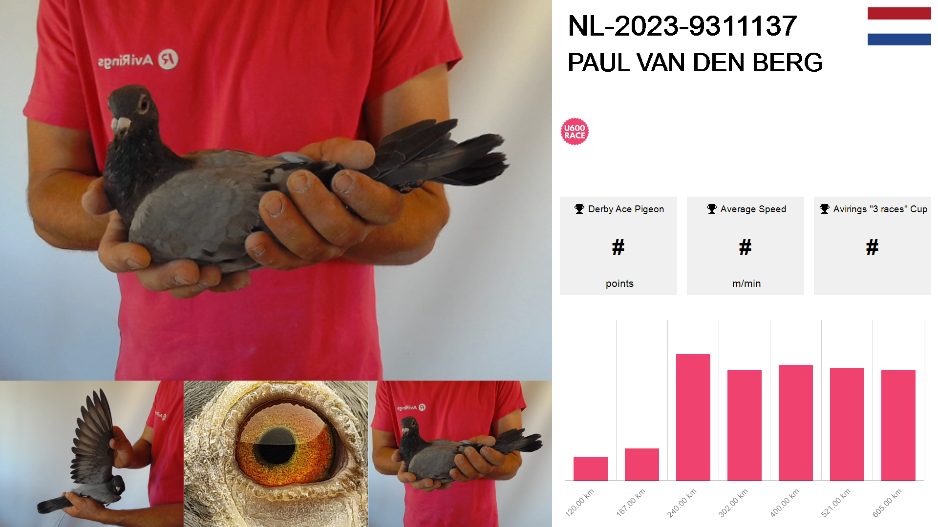 | Race | Position | Number of pigeons | Percent | Speed | Distance |