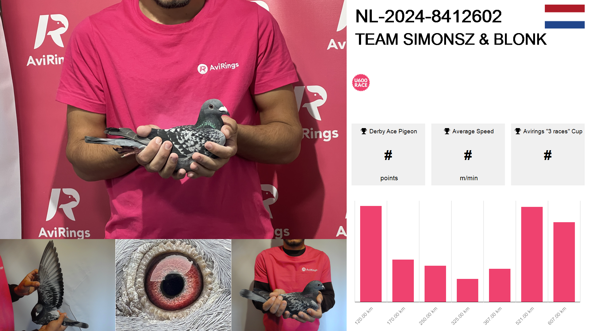 | Race | Position | Number of pigeons | Percent | Speed | Distance |