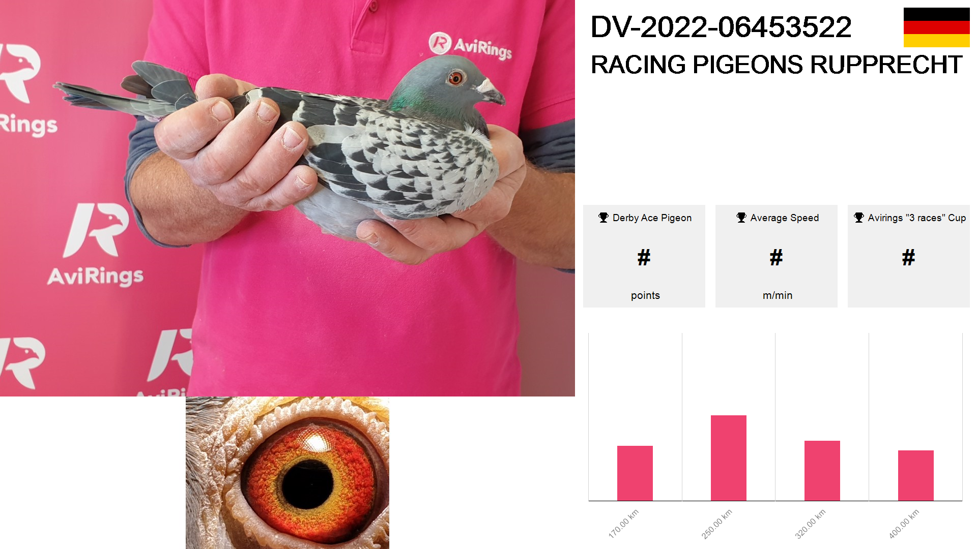 | Race | Position | Number of pigeons | Percent | Speed | Distance |