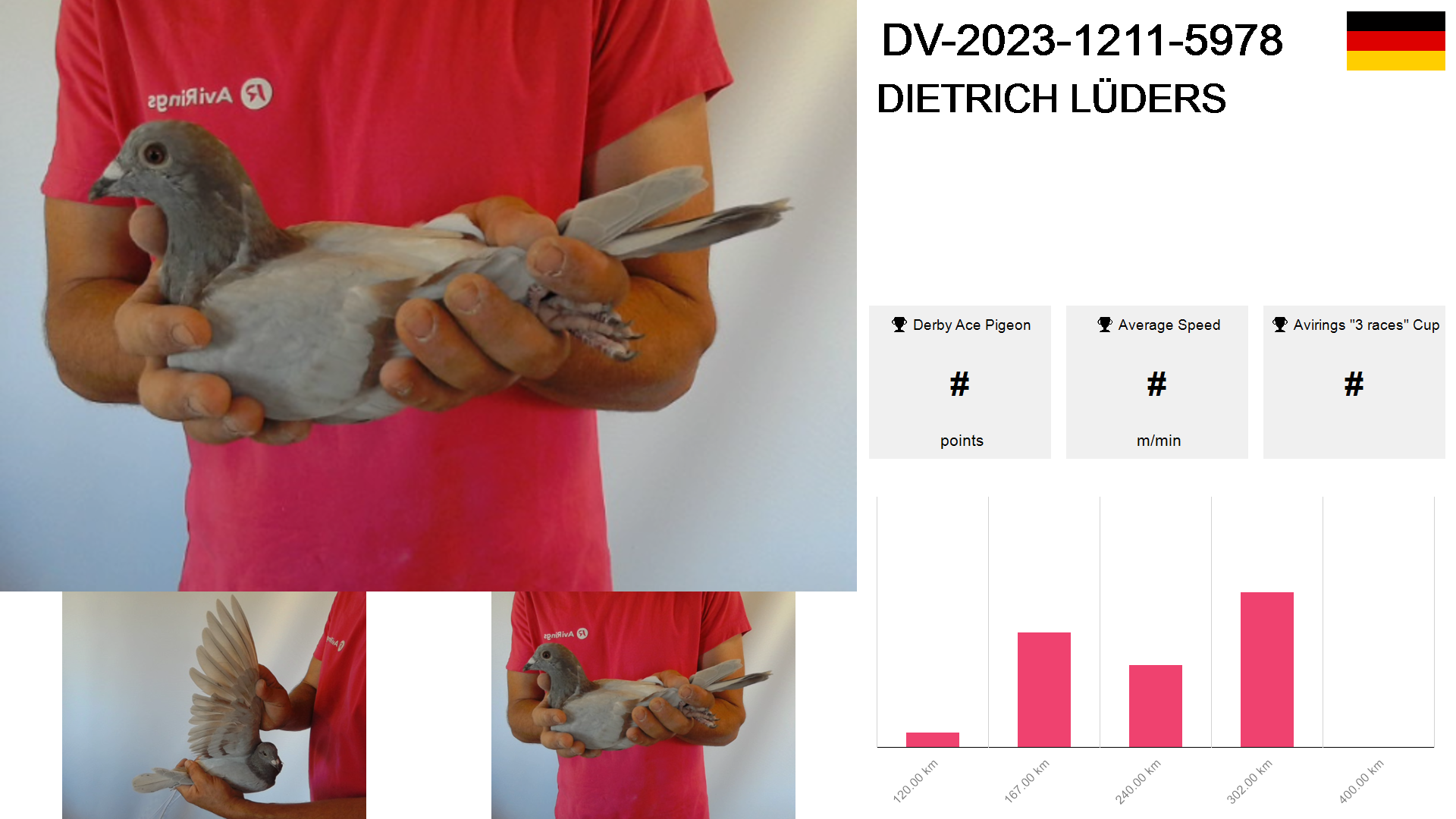 | Race | Position | Number of pigeons | Percent | Speed | Distance |