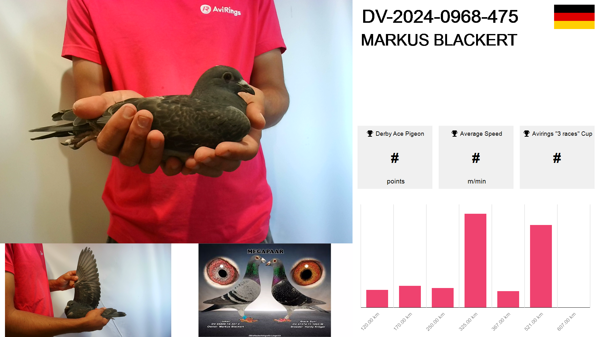 | Race | Position | Number of pigeons | Percent | Speed | Distance |