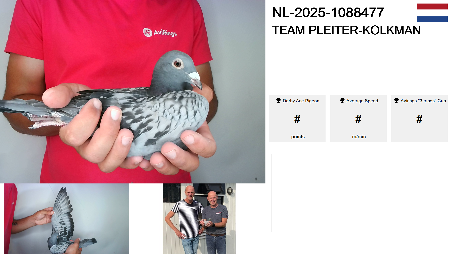 | Race | Position | Number of pigeons | Percent | Speed | Distance |
