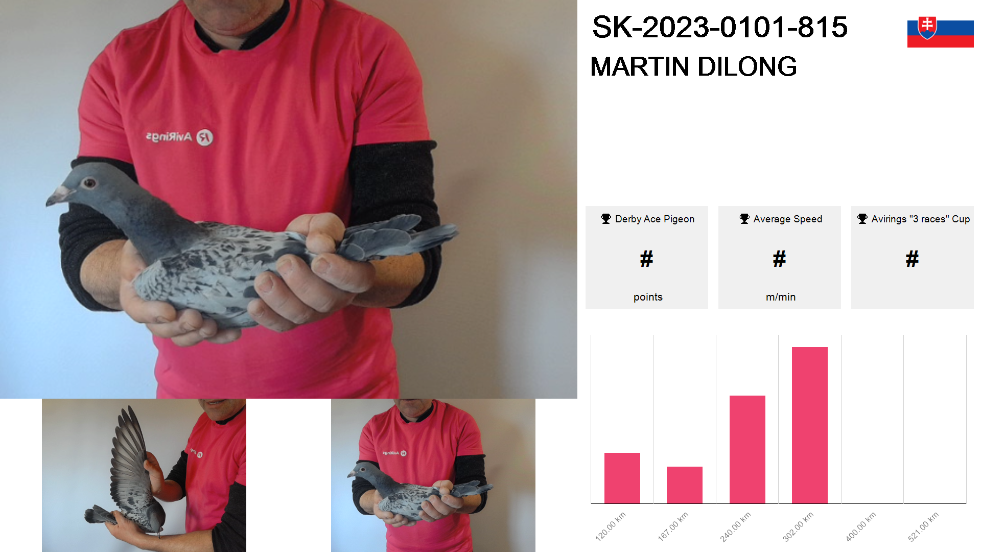| Race | Position | Number of pigeons | Percent | Speed | Distance |