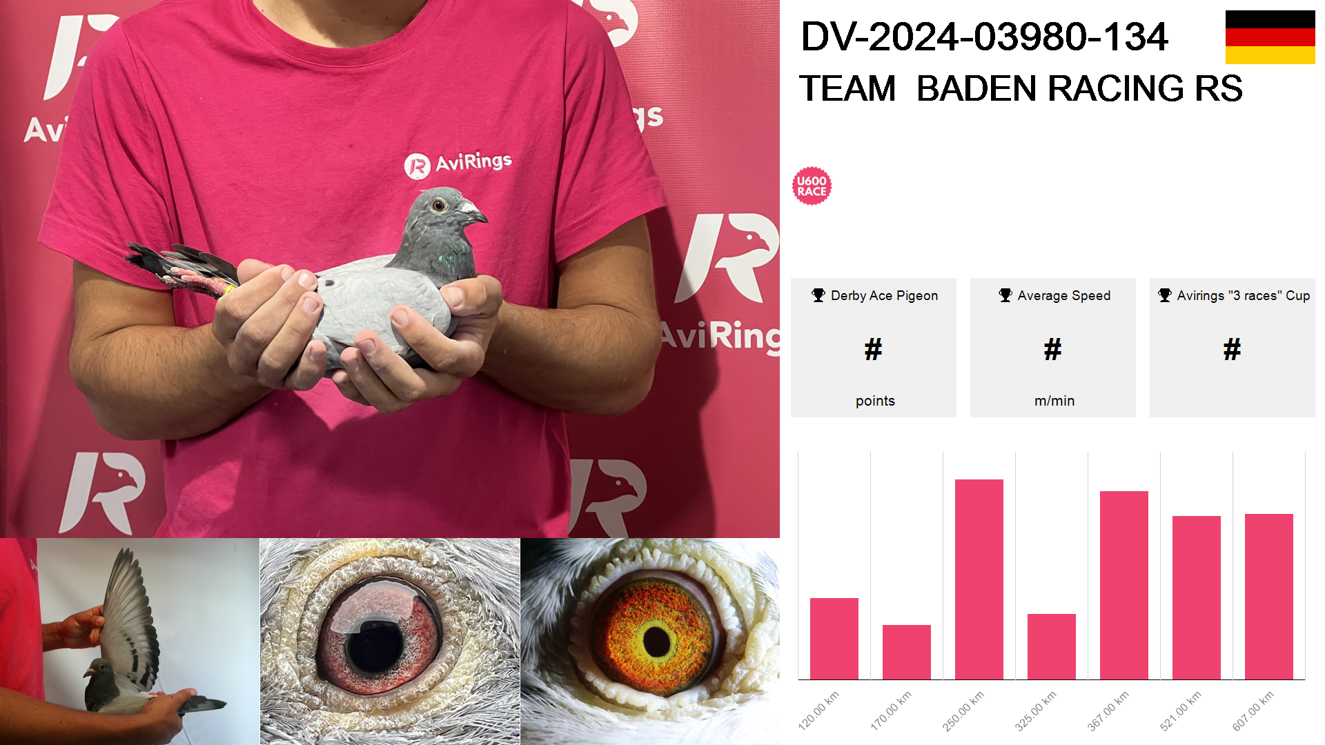 | Race | Position | Number of pigeons | Percent | Speed | Distance |