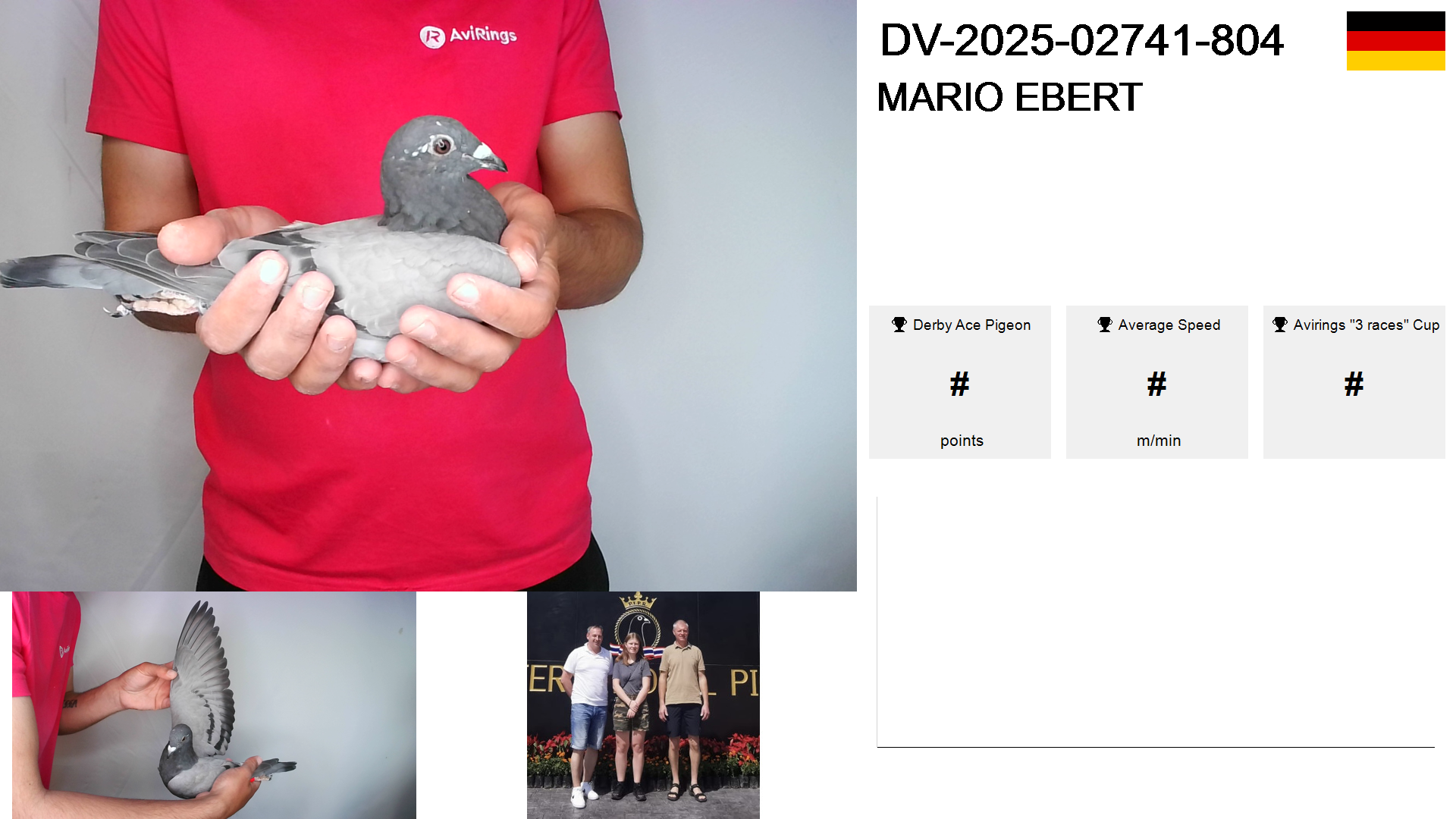 | Race | Position | Number of pigeons | Percent | Speed | Distance |