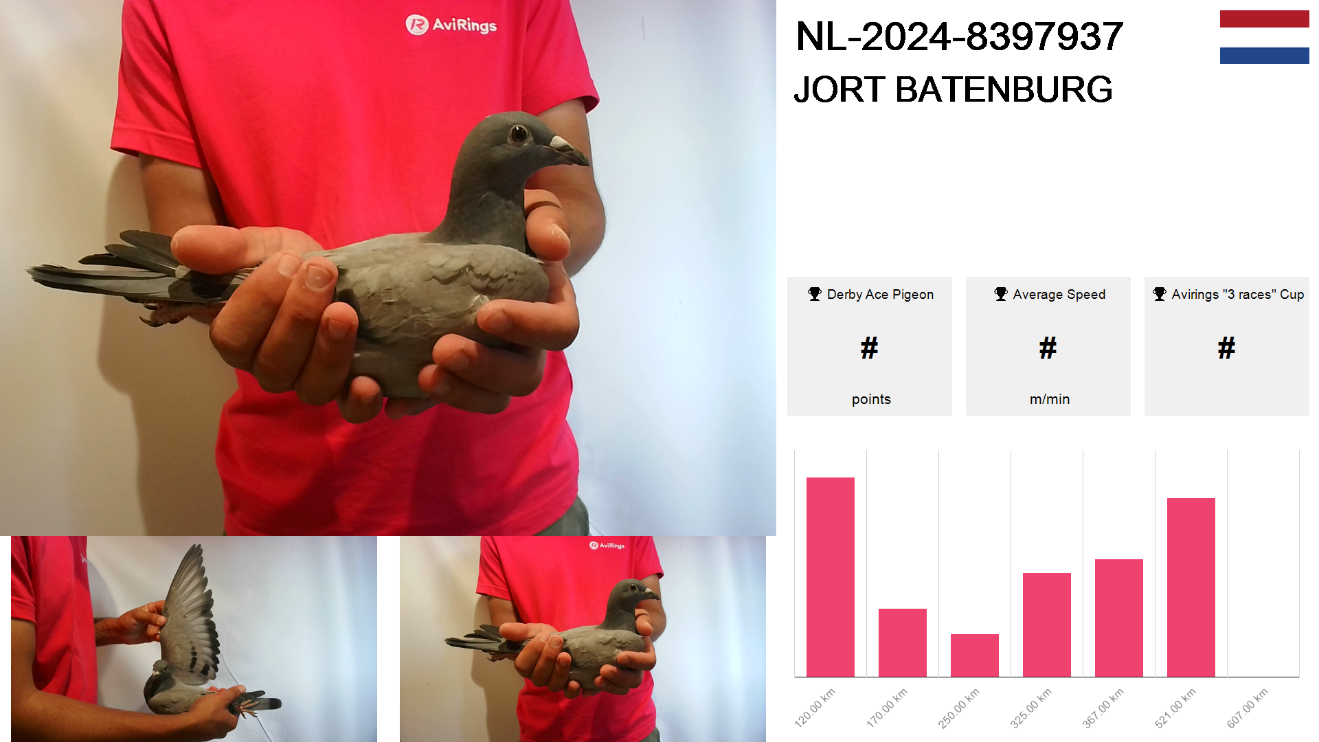 | Race | Position | Number of pigeons | Percent | Speed | Distance |