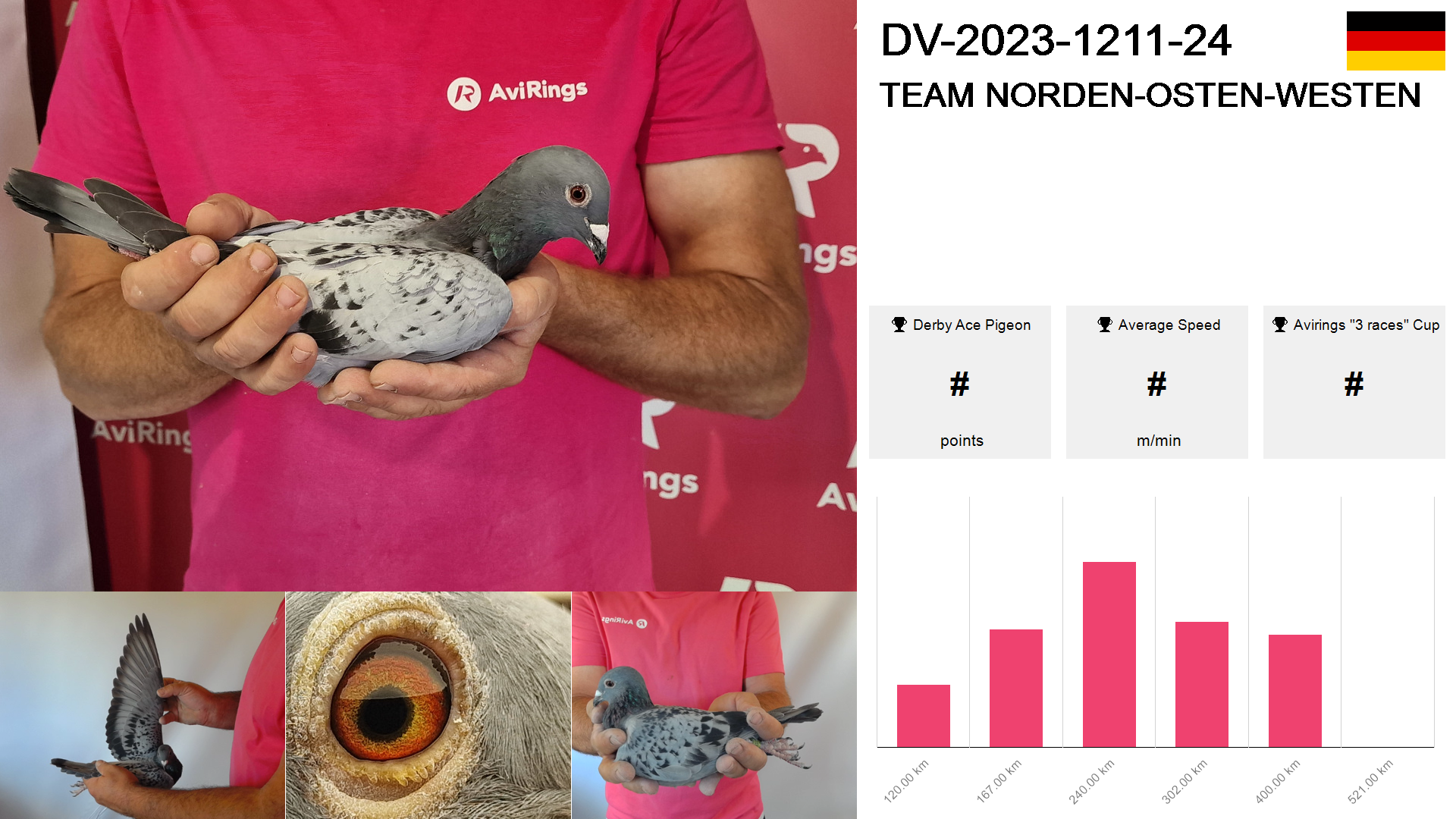 | Race | Position | Number of pigeons | Percent | Speed | Distance |