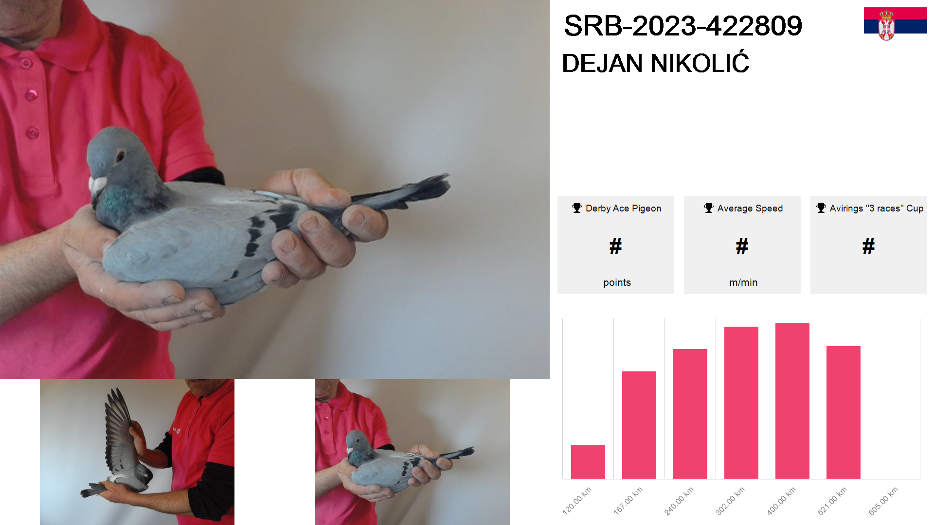 | Race | Position | Number of pigeons | Percent | Speed | Distance |
