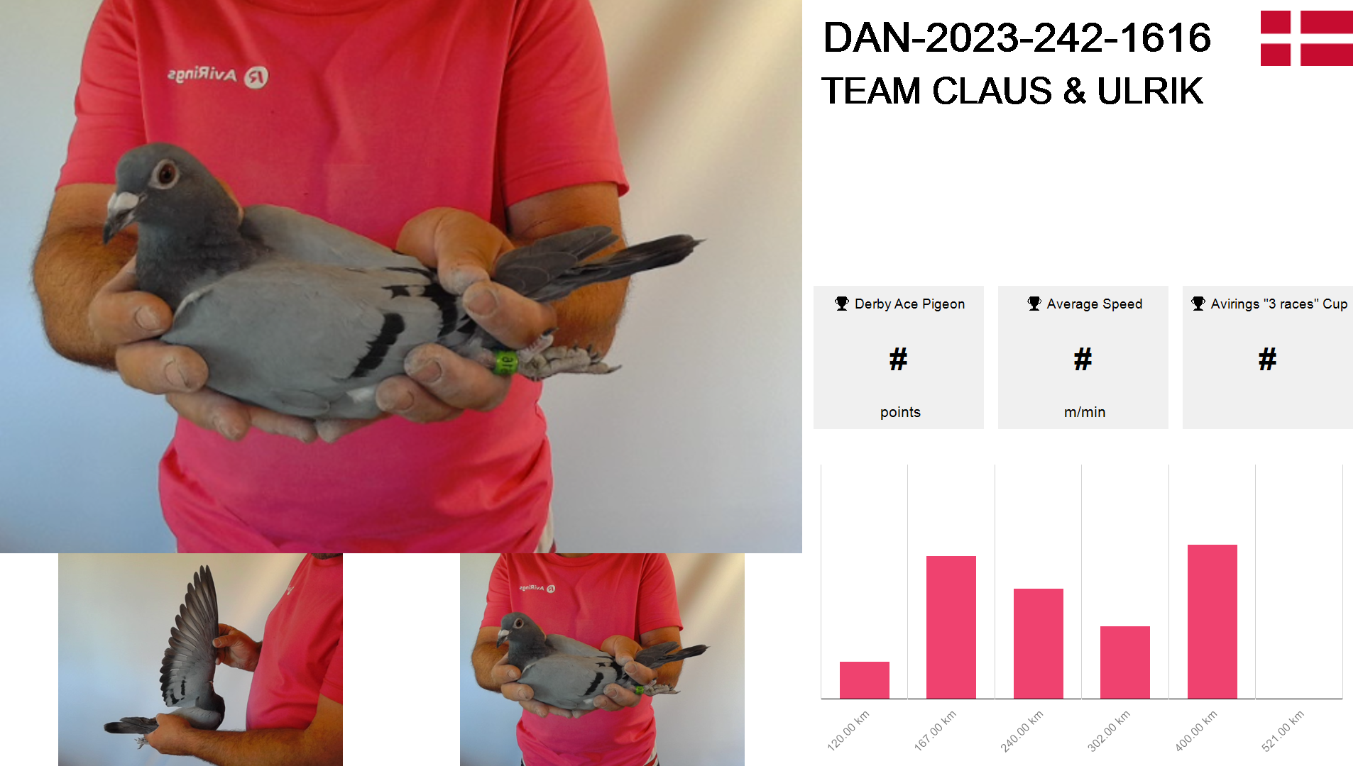 | Race | Position | Number of pigeons | Percent | Speed | Distance |