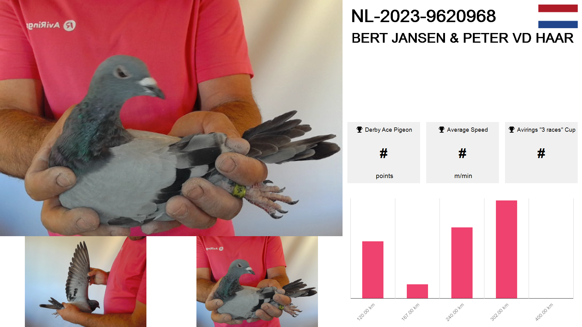 | Race | Position | Number of pigeons | Percent | Speed | Distance |