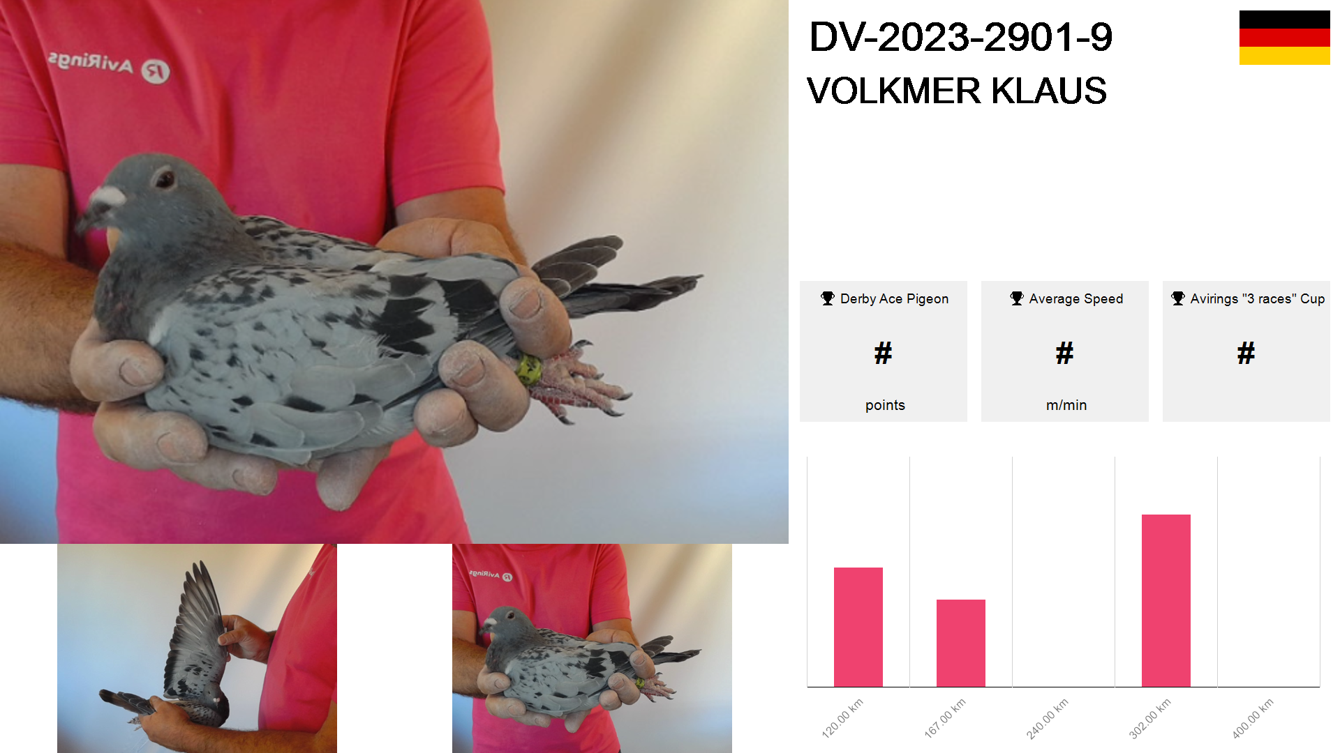 | Race | Position | Number of pigeons | Percent | Speed | Distance |